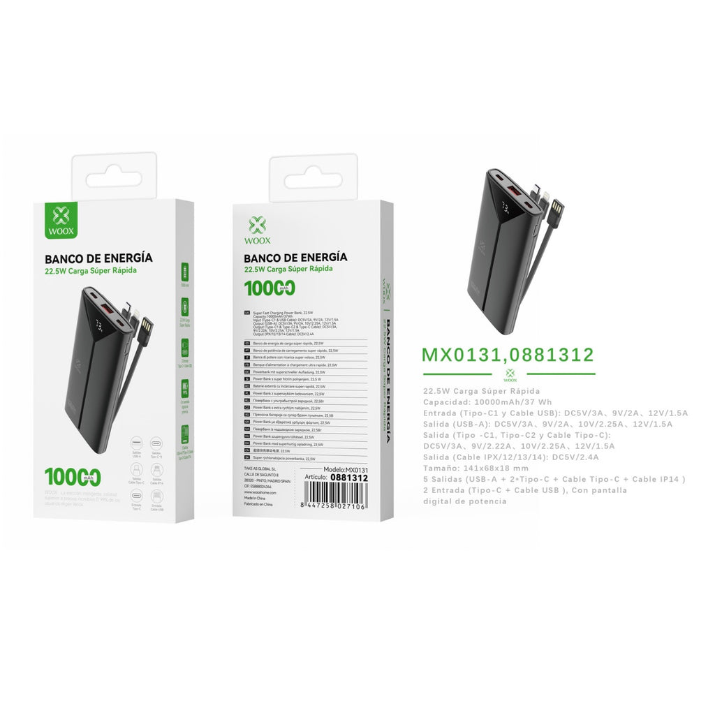 Power bank 10000 mAh 22.5 W with 3 ABS + PC cables (black) - MX0131 NE